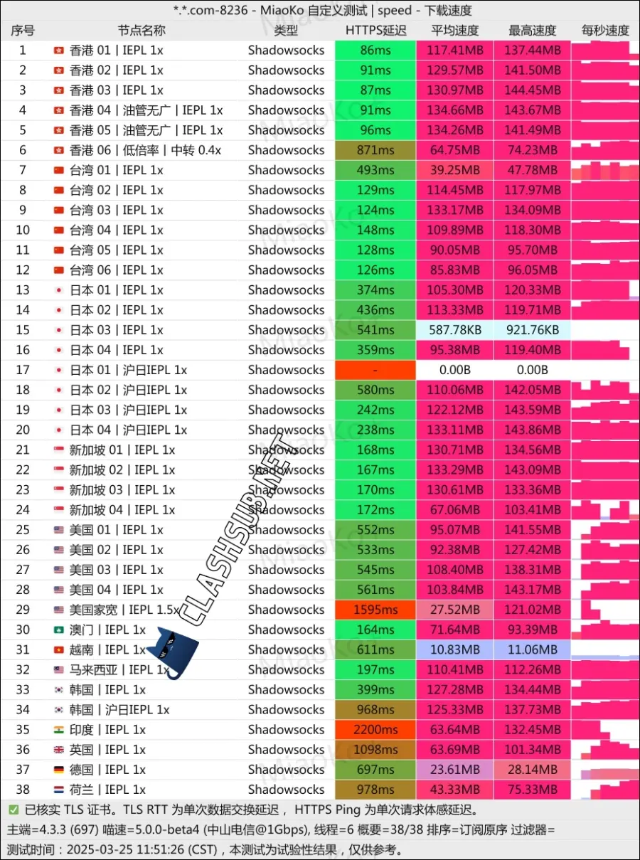 测试节点为 Clash 订阅默认配置自动选择的 香港 03 | IEPL 1x 节点,其他节点使用体验类似。