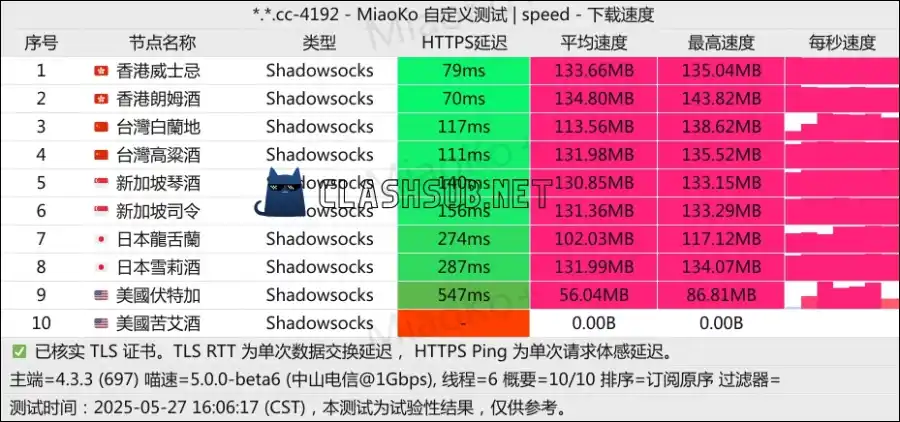 测试节点为 Clash 订阅默认配置自动选择的 香港 威士忌 节点,其他节点使用体验类似。