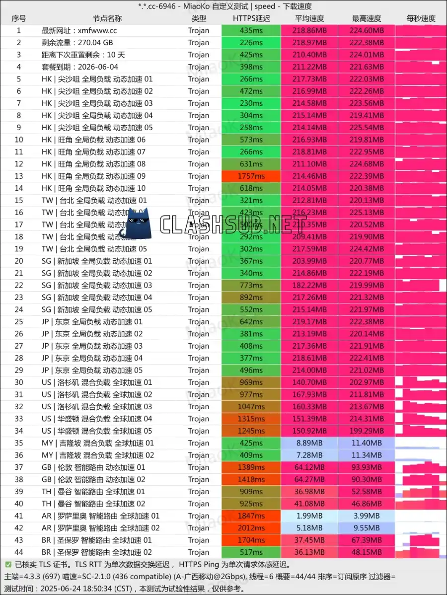 测试节点为 Clash 订阅默认配置自动选择的 HK | 尖沙咀 全局负载 动态加速 04 节点,其他节点使用体验类似。